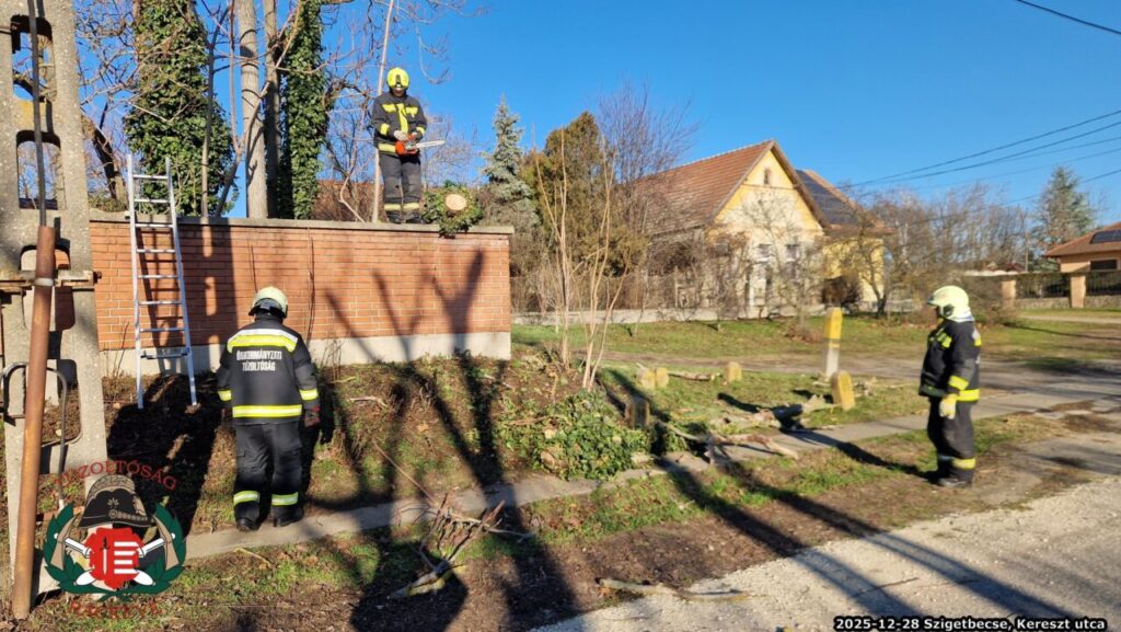 2025. december 28-án 09:45-kor kaptuk a riasztást: Szigetbecse, Kereszt utcánál elemi csapás miatt, műszaki mentésben kértek segítséget. A bejelentés alapján: „Egy magánterületen álló fa ága a közterületen lévő villanyvezetékre dőlt és a vezeték tartja.”