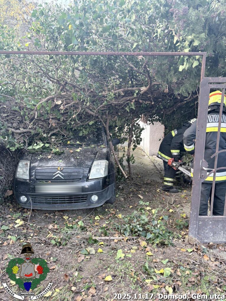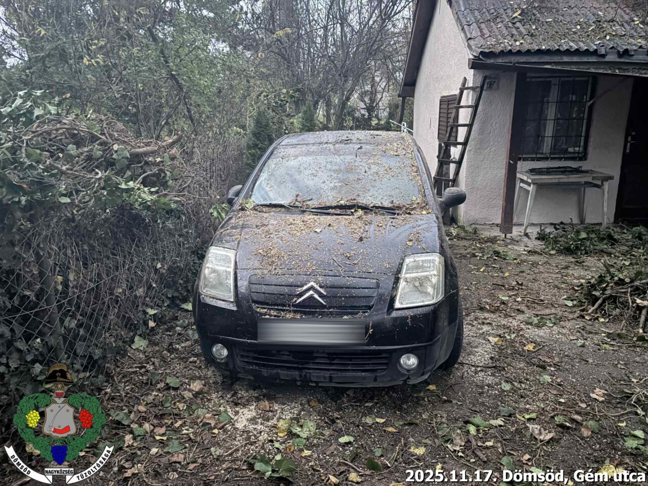 2025. november 17-én15:06-kor kaptuk a riasztást: Dömsöd, Gém utcában elemi csapás miatt, műszaki mentésben kértek segítséget. A bejelentés alapján: ” Üres, lakatlan telekről átdőlt a fa, rádőlt a szomszéd házára, felsővezetékre és a bejelentő autójára. Egy óriási fenyőről van szó. Sérült nincs.”