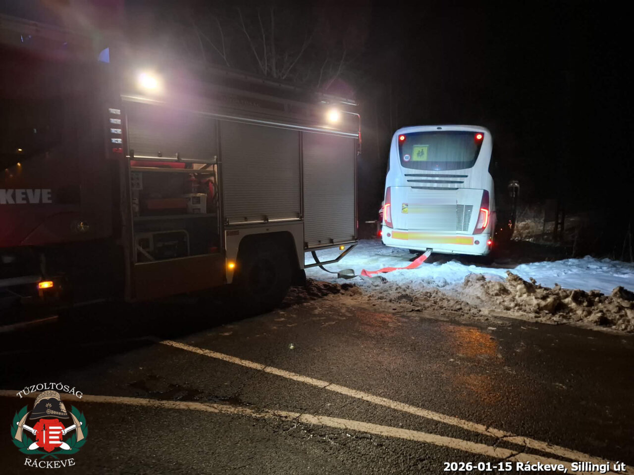 2026. január 15-én 22:23-kor kaptuk a riasztást: Ráckeve, Sillingi útnál baleset miatt, műszaki mentésben kértek segítséget. A bejelentés alapján: „Sillingi út és Kossuth utca kereszteződésénél busz lecsúszott az útról. Hotelbe szállít utasokat, személyi sérülés nem történt. Kb. 2 méterre van az úttól.”